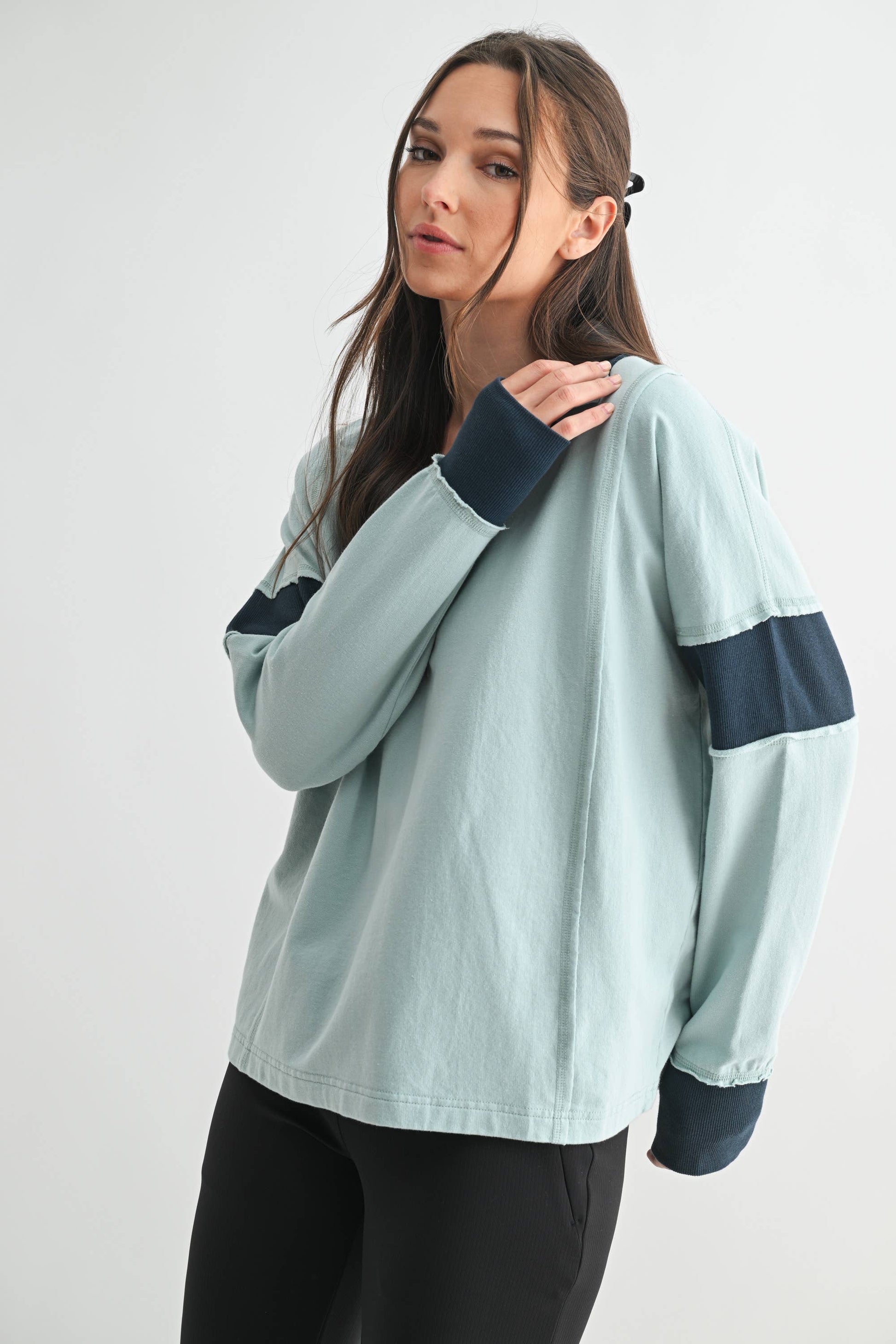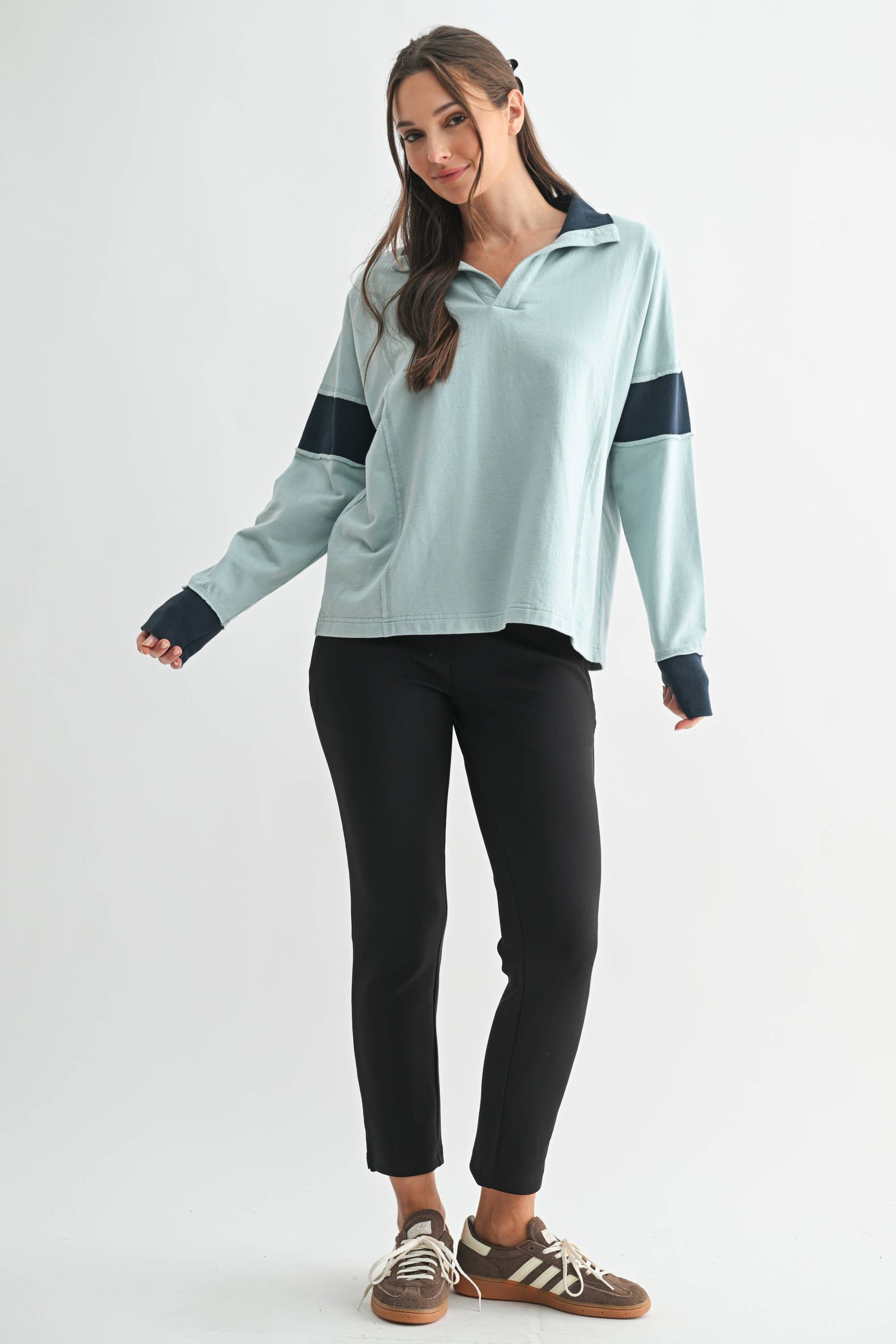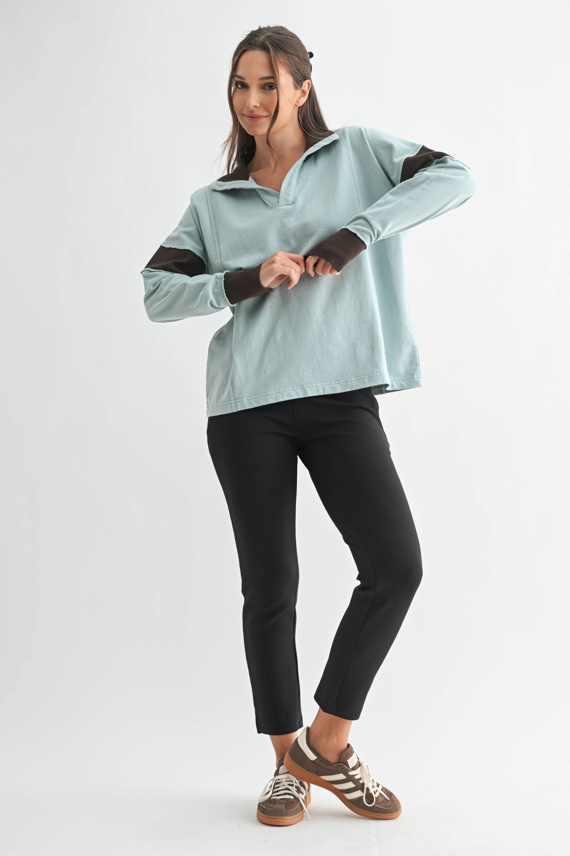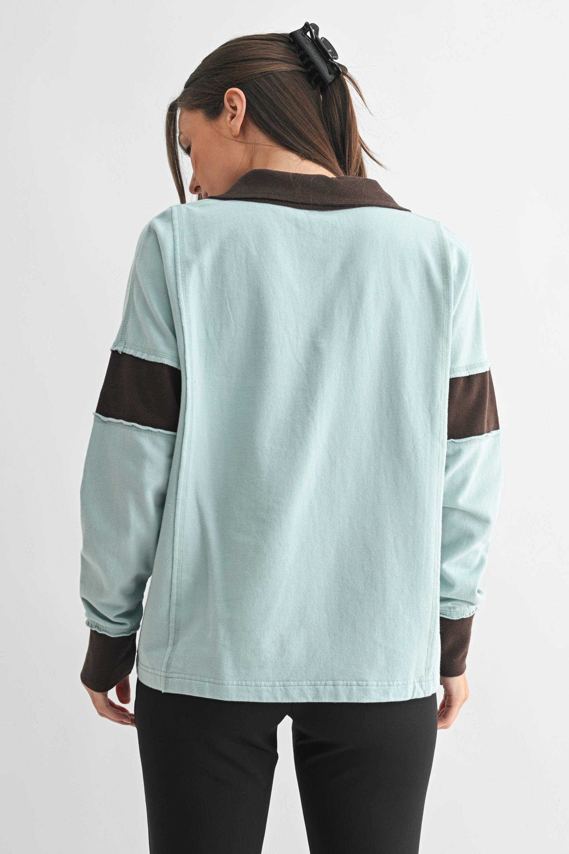 long sleeve collared top made from soft cotton with a cozy fleece interior, offering warmth and comfort in a relaxed silhouette.