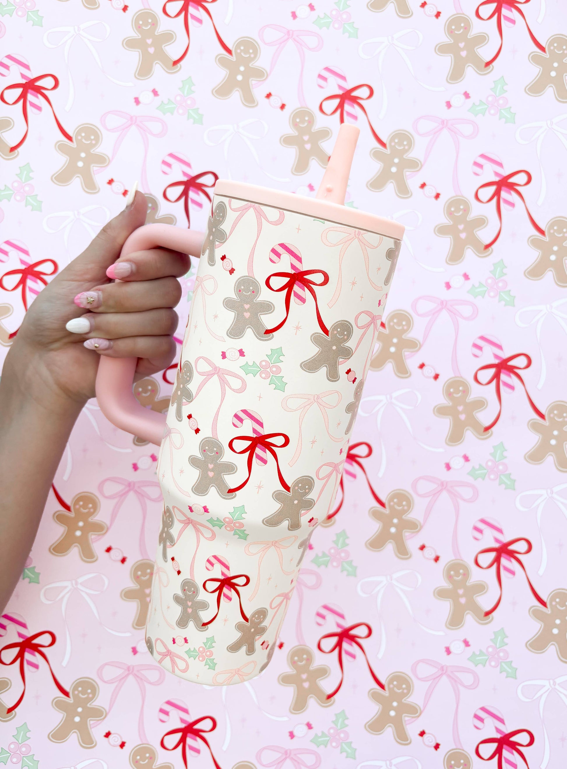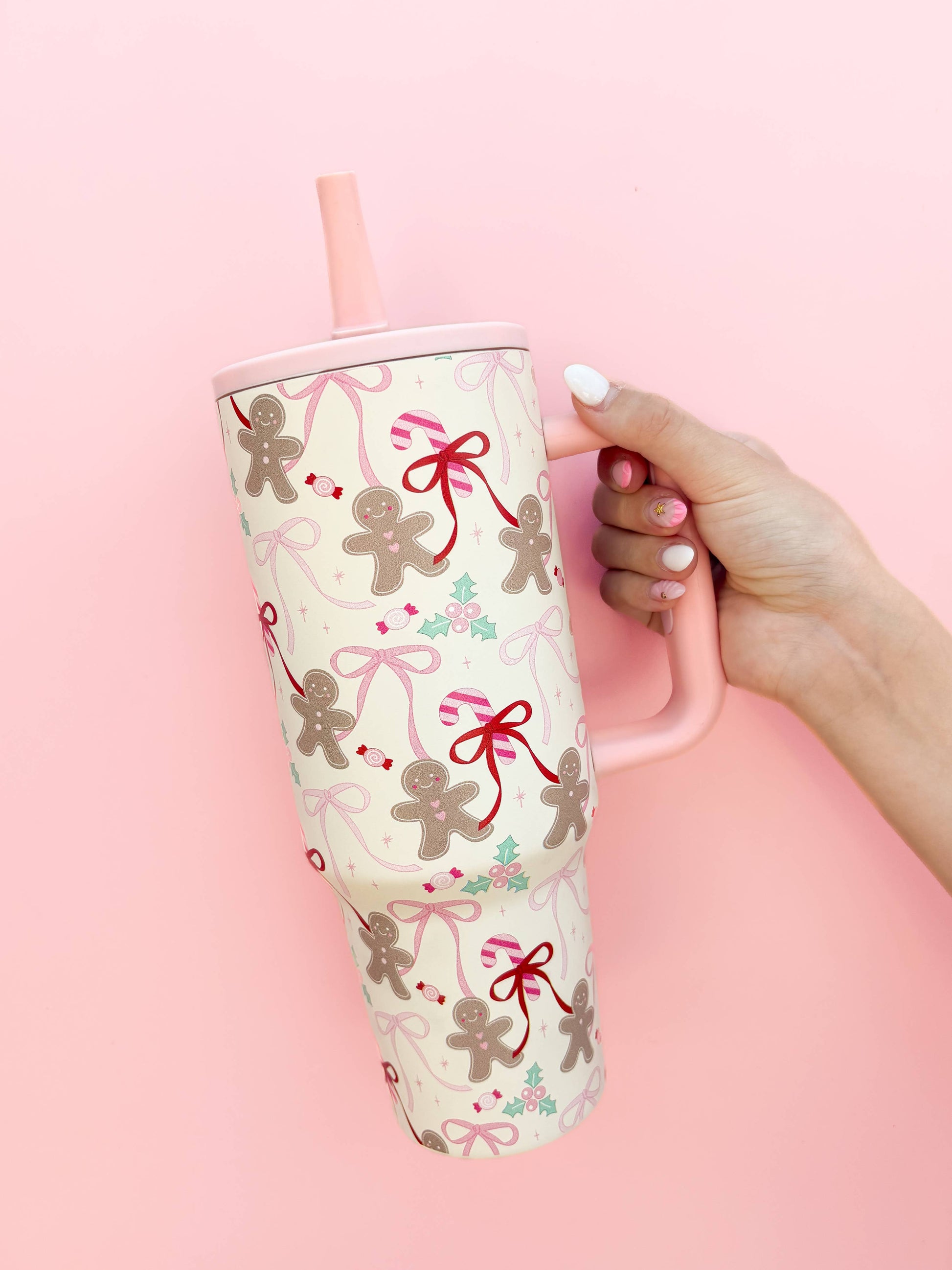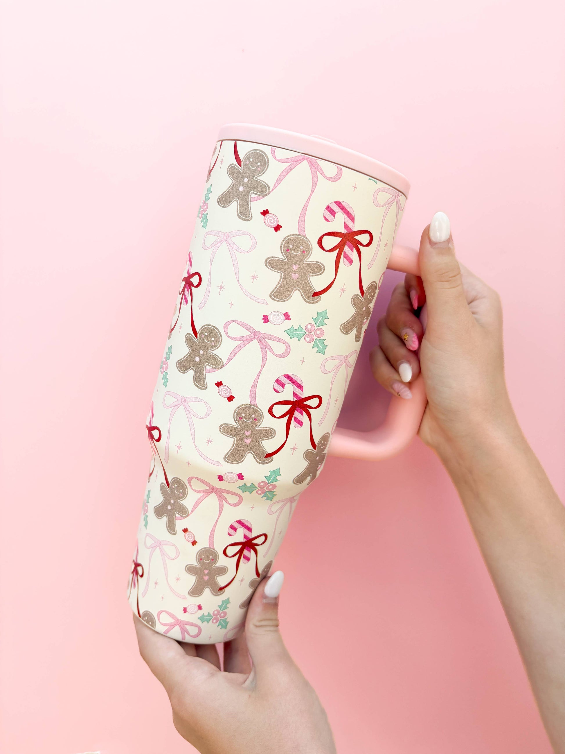 Add a dash of sugar and spice to your sips with our Gingerbread Bows Travel Mug for Christmas 2025! Featuring a festive flurry of smiling gingerbread cuties, candy canes, swoopy bows, and holly on a cream background, this 40oz tumbler is made to bring holiday cheer on the go and giftable smiles. The soft pink handle adds a sweet touch, while the double-walled insulation keeps your drinks hot or cold through all your merry moments. Whether you're dashing through errands or cozying up by the fire, this cup is your new holiday sidekick!